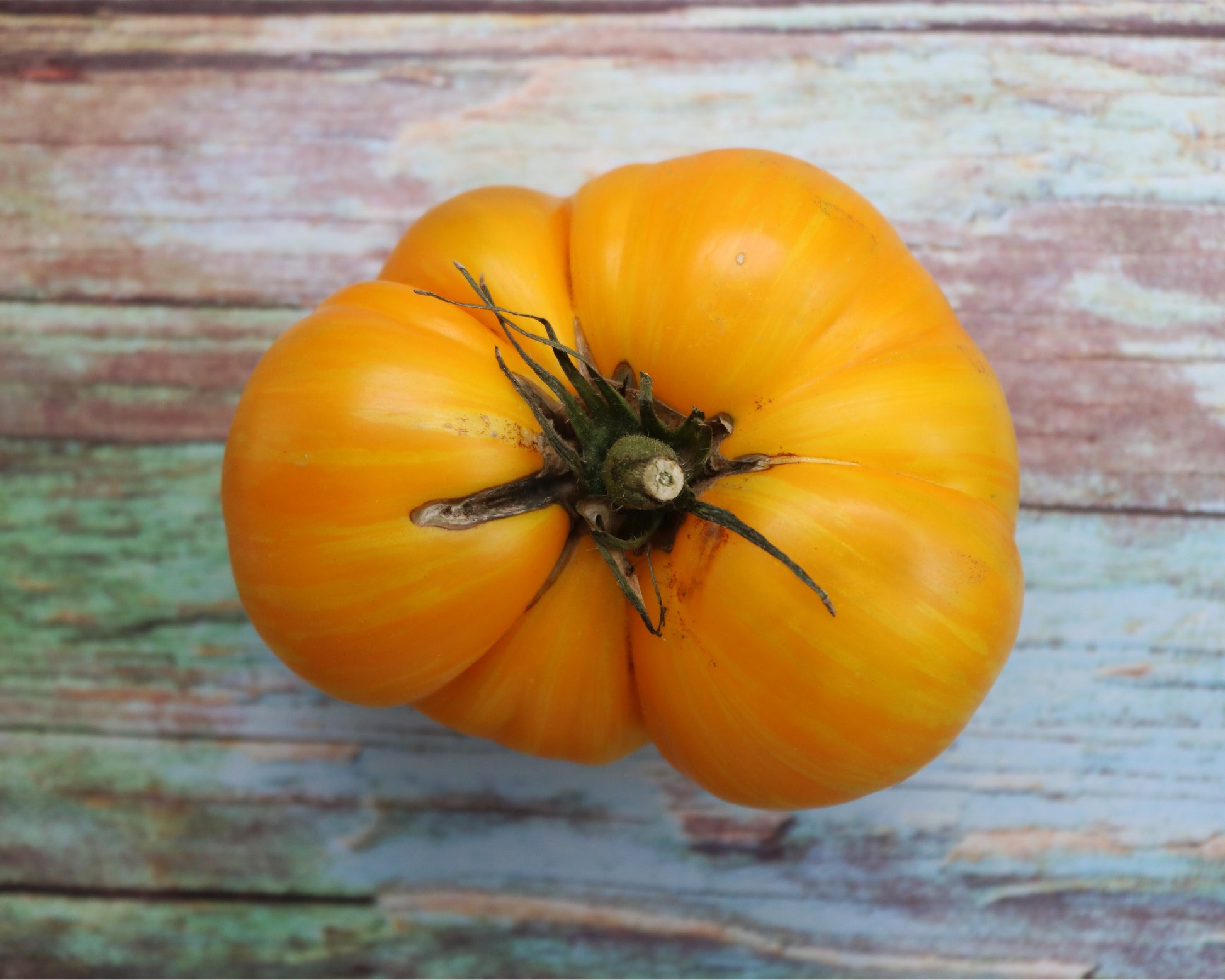 The Big Yellow Zebra tomato is a big bright yellow color with orange stripes that has great flavor. Weighing about 10-20 ounces this pretty beefsteak grows on tall vines that produce plenty of fruits. If you love sweeter but not too strong tomatoes, this will work well for you. This tomato has a rich finish and plenty of real tomato taste. Perfect for sandwiches, nice yellow sauce, cooking, and market sales. Stake well!