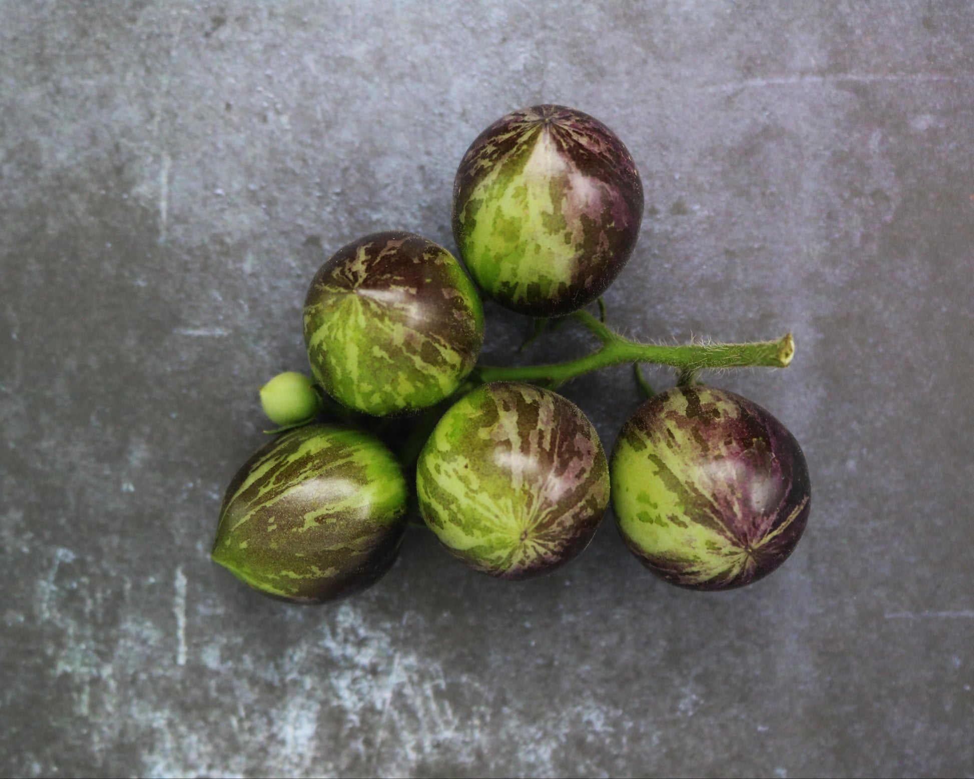 Exotic small striped oval-shaped fruits that start off green with beautiful purple anthocyanin stripes and splashes. As it ripens it turns multiple shades of red and black with dark stripes and flecks of gold. The flavor is good with a wonderful fruity aroma. Intense sweet taste with high red contrast meat colors. Blue influences are deep into the flesh. The name describes the marvelous transformations of this strain. Another fantastic breeding from Brad Gates.