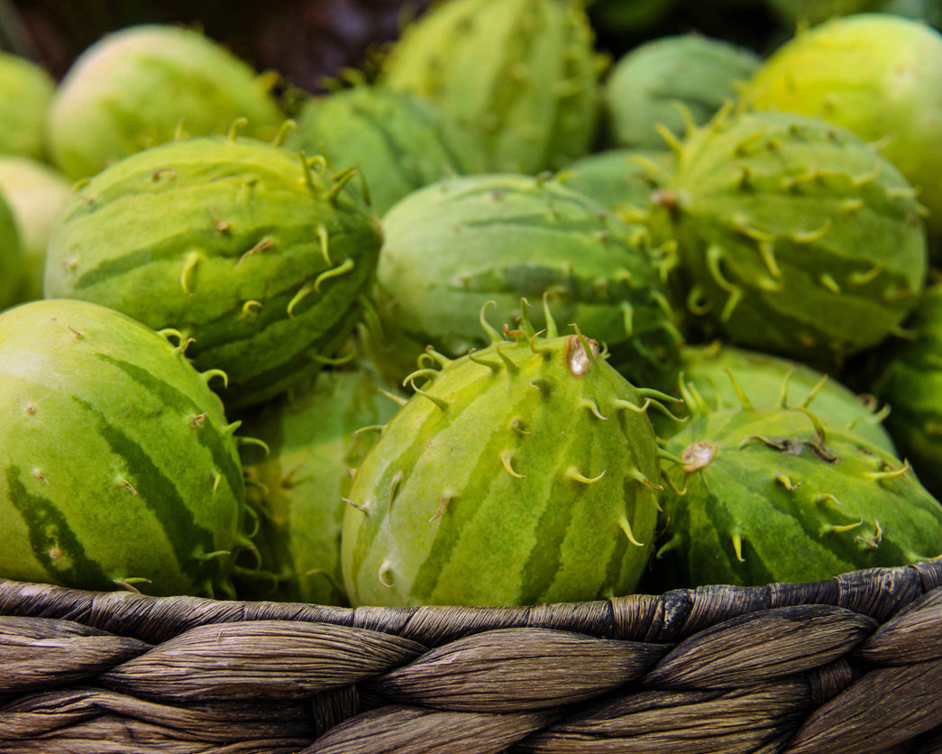 A rare and unique cucumber relative originating in West Africa and brought to Jamaica via the trans-Atlantic slave trade in the 1500s. It is still a very popular vegetable in Jamaica. The 1-2″ long, light green fruit is covered with soft spine-like bumps, giving it a unique look. Best eaten when small and young, before filling up with seeds. Our dogs also seem to love them and have been caught stealing them when we aren't looking. With a mild, slightly tangy flavor and a pleasing crunch, burr gherkins are fantastic pickled, cooked in stews and stir fry, and raw in drinks.