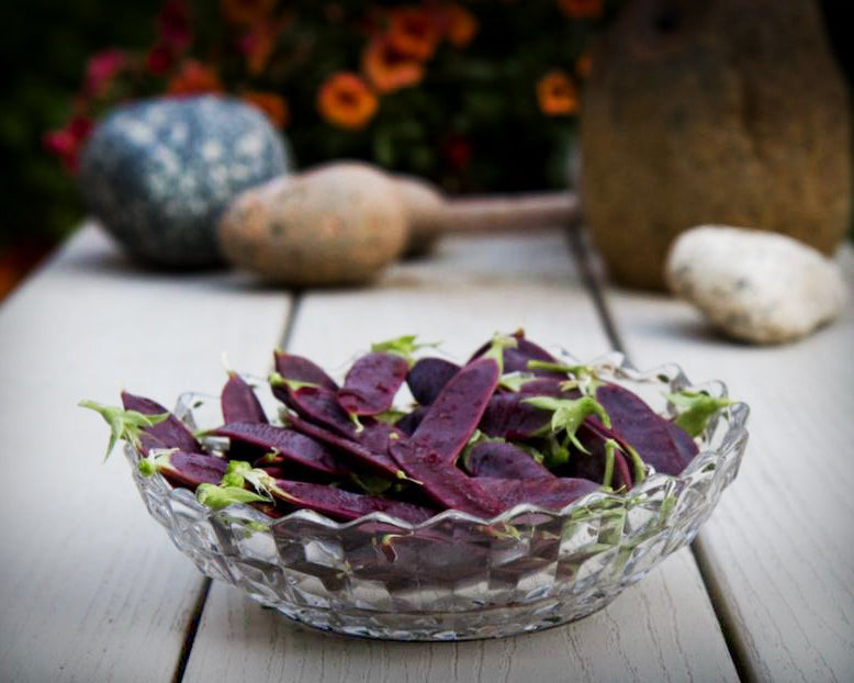 Beautiful 3–3 1/2" snow pea pods. The flavor is pleasant, though they can be mildly bitter. They make a great addition to salads or as an edible garnish. For the most intense color, use them raw, but they can be lightly steamed or sautéed. They stay purple if lightly cooked, but they can become "muddy" if overcooked. The 2 ft, pink-flowered vines produce two pods per node. Because they are shorter, they need little to no staking.