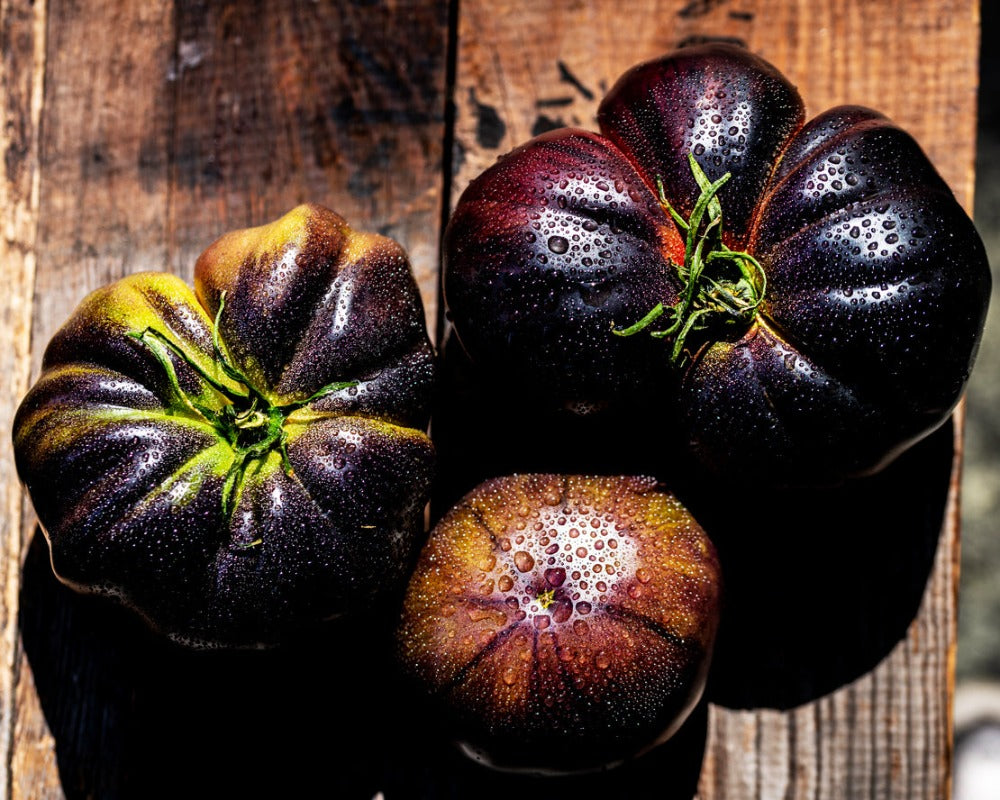 Gorgeous, deep blue-black shoulders make this unique among slicing types. The plant produces lots of meaty pink beefsteak-shaped tomatoes with a lovely dark blue Anthocyanin top. If the fruits get enough sunlight they can turn completely dark blue/black! They are stable on the vine for longer than most and have good, sunburn, and crack resistance. Very good complex and deep flavor. The fruit is a modest beefsteak-type slicer, weighing up to 8 ounces. This recent Brad Gates introduction was selected from a cross between Beauty King and a blue tomato.